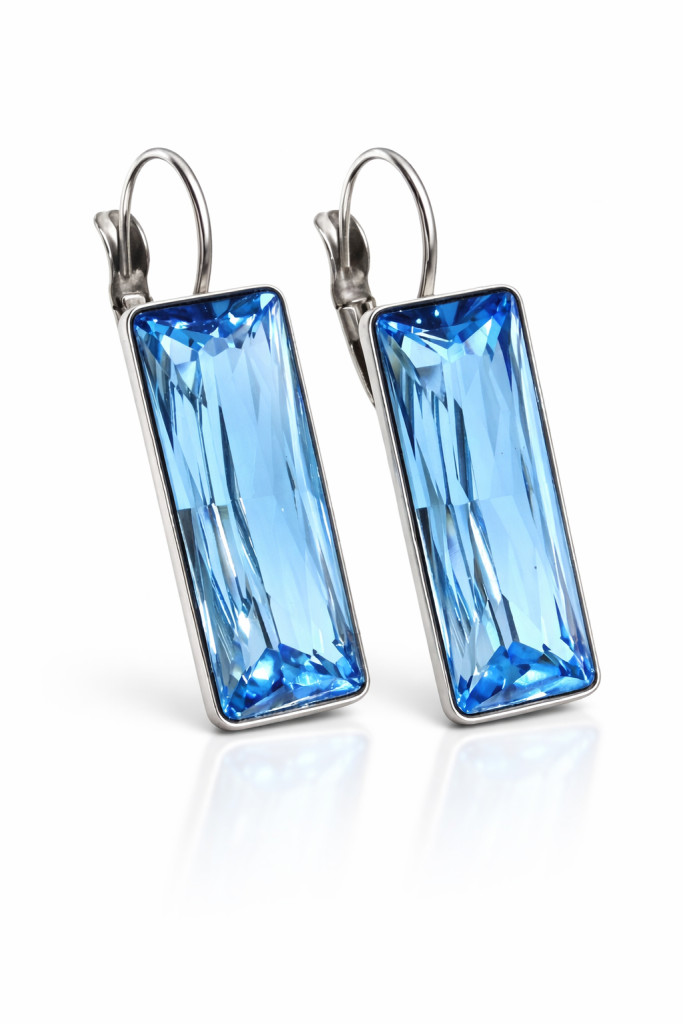 Gyönyörű világoskék osztrák kristály felhasználásával készült látványos, francia kapcsos fülbevaló 24X8 mm-es méretben, bőrbarát, nemesacél alapon ezüstös csillogással. Kitűnő ajándék ünnepekre, úgy mint születésnap, névnap, ballagás.