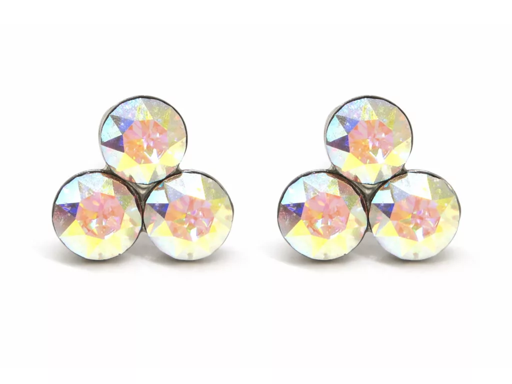 Tripla bedugós fülbevaló 10 mm: bőrbarát nemesacél alap, 3x5 mm csiszolt kristály. Különleges színek, elegáns csillogás, kényelmes mindennapi viselet.
